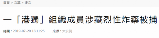 报道还提及香港近来发生暴力冲击事件,警方表示,今日检获的高杀伤力烈性炸药等物品是否与近期的香港的所谓示威活动有关,是调查的方向之一。