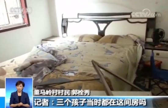 房子砸塌了,门开不开,小孩和他奶奶从窗户爬出来了。脸上、头上、脖子缝了十几针了,刚做完CT。