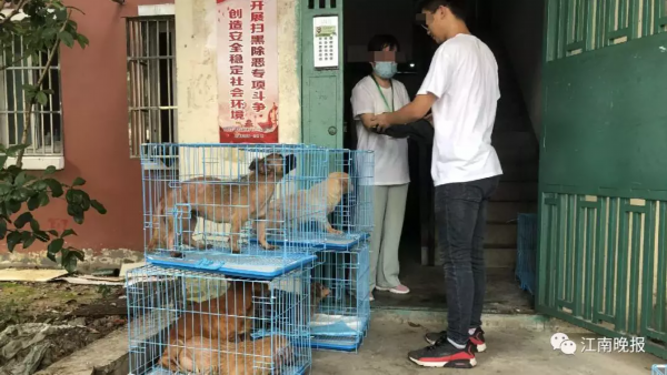7月19日上午,动物保护中心工作人员在城管和社区帮助下,将老人家中的狗狗安置在笼中带走。工作人员介绍,狗狗会统一送去宠物医院体检,安排绝育、打疫苗、体内外驱虫,然后寻求社会力量暂时安置,后期通过“无锡领养日”平台开放领养。