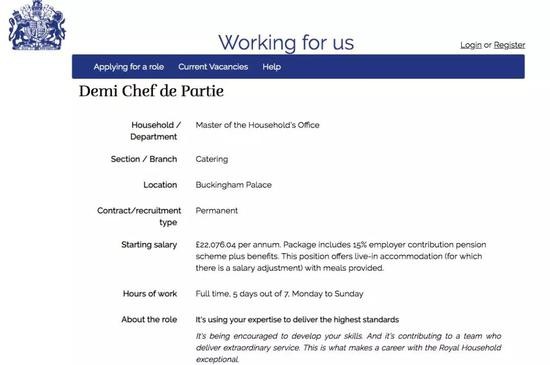一周工作五天,年薪22076.04英镑,另外还有15%的养老金和定额福利。最重要的是,这一职位提供白金汉宫内的住宿和餐饮。工作过程中,可能需要去往伦敦之外的王室住宅。