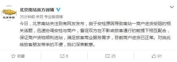 荔枝新闻讯 据“北京南站官方微博”消息,7月21日,北京南站关注到有网友发布,由于安检原因导致南站一商户进货受阻的相关话题,迅速协调安检与商户,督促双方在不影响旅客通行的前提下相互配合,保证商户货物顺利进站,满足旅客商业服务需求,目前商户进货已正常。对由此给旅客朋友带来的不便,我们深表歉意。