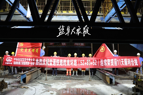 7月21日零时20分,随着最后一车混凝土的浇筑完成,中铁四局盐通铁路I标盐城南特大桥跨南环路高架连续梁顺利合龙,为后续架梁施工奠定了坚实的基础。