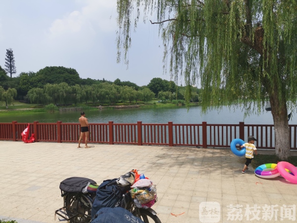 7月21日中午,记者来到位于雨花台区的花神湖畔,尽管骄阳下的气温超过35℃,但仍有不少市民下水图个清凉。市民们在柳树下脱下外衣,准备下水游泳。在花神湖游泳的市民中,中老年男子占据了大多数,还有不少年轻父母携子女一同游玩的。记者了解到,每天在下午四点多前来游泳的人数剧增,进入市民“野游”的高峰期。