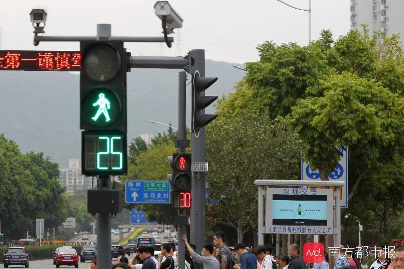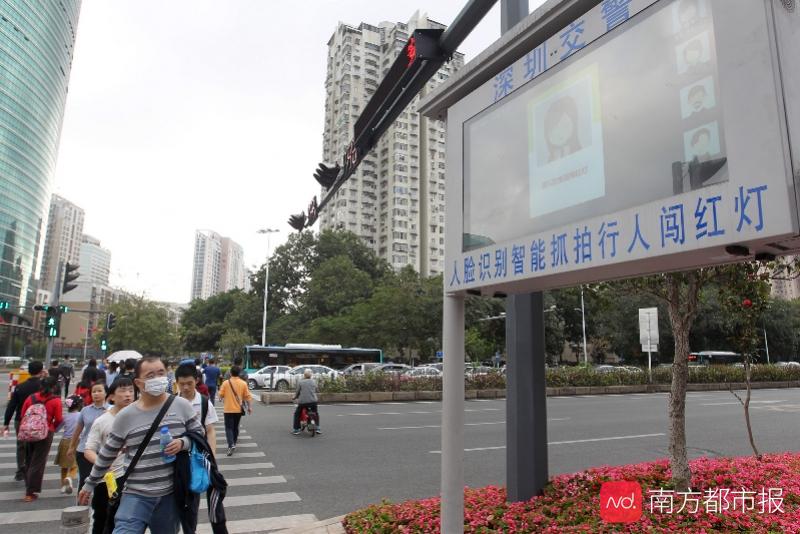 资料图片:2018年3月18日,深圳莲花路与新洲路路口,安装在路口的人脸识别智能抓拍行人闯红灯显示屏。南都记者 刘有志 摄