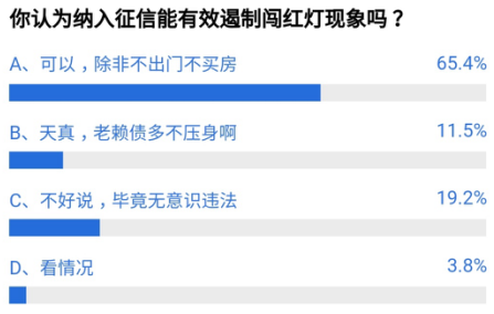投票结果显示,65.4%的网友认为纳入征信能有效遏制闯红灯现象,近20%的网友则认为不好说,主要还是法律意识的问题,也有11.5%的网友表示,以为纳入征信就能遏制闯红灯,还是太天真了。