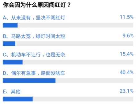 在“你会因为什么原因闯红灯”一项投票中,4成网友表示是因为“偶有急事,路面没啥车”。也有网友表示是出于无奈,15.4%的网友因为机动车不让行而闯红灯,9.6%的网友则是因为马路太宽,而绿灯时间太短。仅有11.5%的网友表示从来没有闯过红灯。