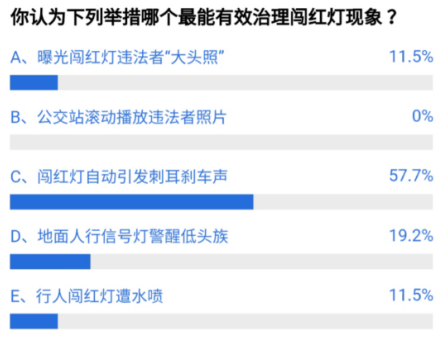 在网友票选的“最能有效治理闯红灯现象的举措”中,“闯红灯自动引发刺耳刹车声”获得了近6成网友认可,而针对行人闯红灯现象,也有19.2%的网友选择“地面人行信号灯提醒低头族”。另各有11.5%的网友认为曝光闯红灯违法者“大头照”、行人闯红灯遭水喷是最有效的举措。