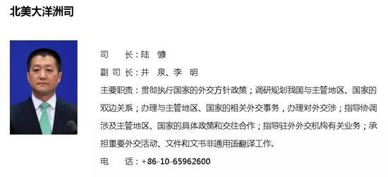 根据外交部官网描述,赴任美大司后,陆慷的主要工作职责将包括:调研规划我国与主管地区、国家的双边关系;办理与主管地区、国家的相关外交事务,办理对外交涉;指导协调涉及主管地区、国家的具体政策和交往合作;指导驻外外交机构有关业务;承担重要外交活动、文件和文书非通用语翻译工作等。