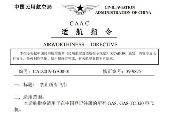 适航指令指出,2019年7月14 日,一架 GA8 Airvan飞机在瑞典境内一次伞降飞行中发生致命事故。有迹象表明,飞机于4000米高空结构失效。早期报告称,飞机机翼可能在事故发生前脱落,但目前还不能确定事故的根本原因。因此,中国民航局决定停飞在中国登记注册的所有受影响飞机,直至另行通知。