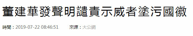 董建华在22日早上发表声明,谴责污损国徽的行为:对于昨晚有示威者围堵及冲击中央驻港机构,涂污国徽的行为,令人感到非常痛心和愤怒。
