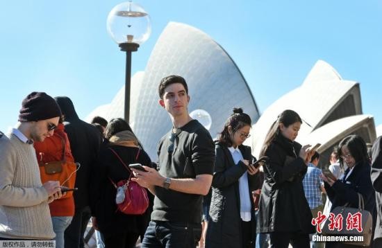 资料图:聚集在澳大利亚悉尼歌剧院前玩手机的年轻人。
