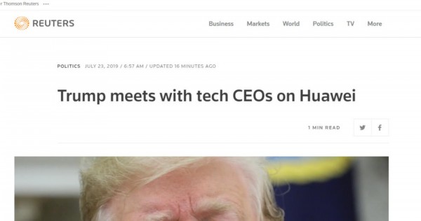 据路透社报道,美国总统特朗普周一与美国七家科技公司的CEO举行了会面,在会面中七家科技公司的CEO表示,要求美国商务部就这些公司向中国华为公司供货及时发放许可证。