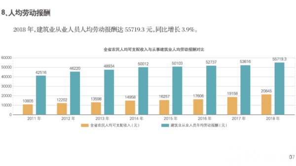 2018年,建筑业从业人员人均劳动报酬达55719.3元,同比增长3.9%。