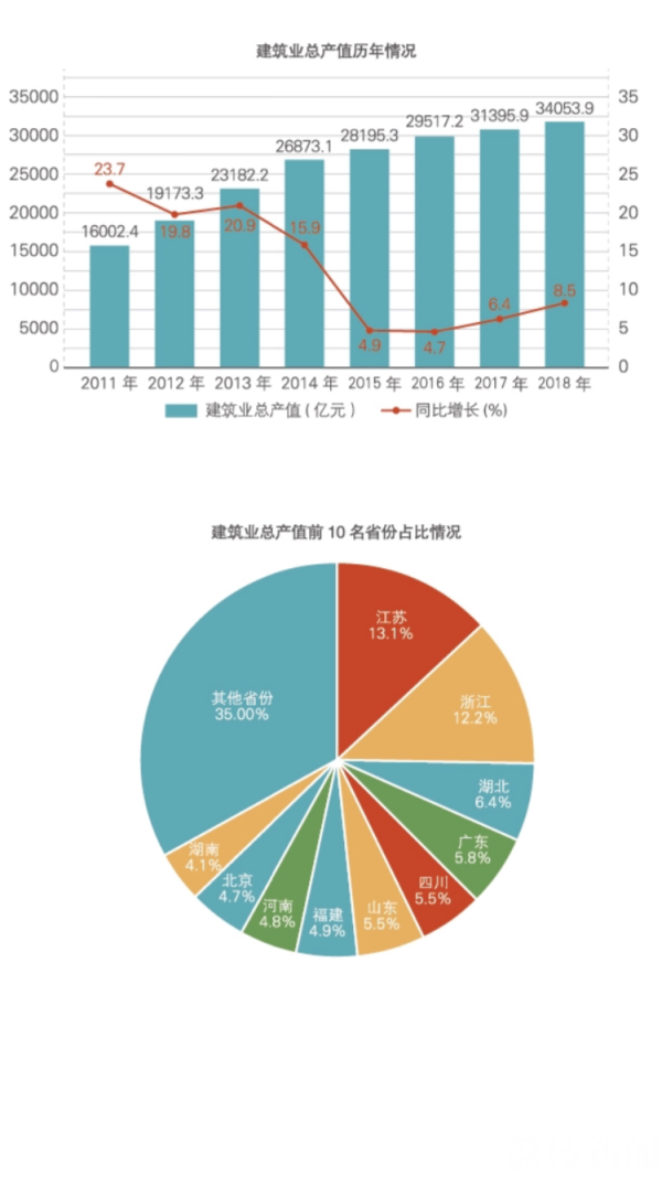 2018年,江苏共实现建筑业总产值34053.9亿元,比上年增长8.5%,增幅较上年提高2.1个百分点。取得“十三五”以来最高年度增幅。在全国建筑业总产值中占比13.1%,产值规模继续保持全国第一。