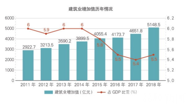 建筑业增加值5140.6亿元,占全省GDP的5.5%,GDP贡献率连续13年稳定在5-6%之间。