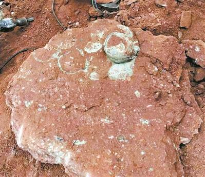 昨日10时许,河源市民李小芳带着儿子张仰喆来到东江大桥附近的东江河边游玩。张仰喆在大桥便道护坡寻找石头时,无意中发现红砂岩层中有一枚圆形的石头露出了土面,类似老师上课时跟他们讲的“恐龙蛋化石”。