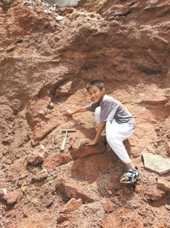 小学生张仰喆游玩时意外发现恐龙蛋化石后,及时报警保护化石。