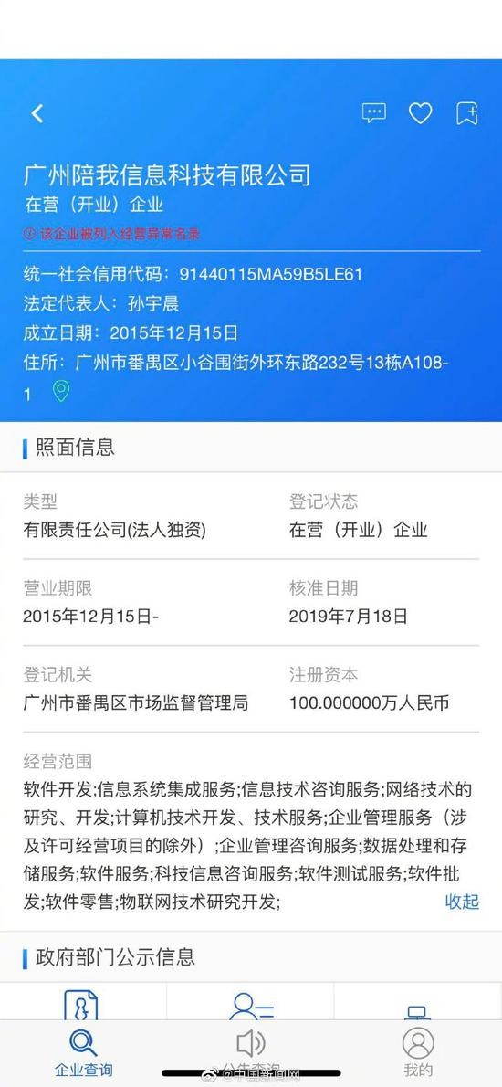 据国家企业信用信息公示系统显示,广州陪我信息科技有限公司被列入经营异常名录。 企查查显示,该公司法人正是巴菲特午餐的拍到者、陪我APP董事长兼CEO孙宇晨,注册资本100万元,通过股权穿透可看出,孙宇晨100%持股。该公司曾用名为广州锐波信息科技有限公司 。