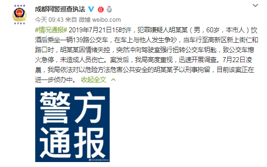 荔枝新闻讯 成都市公安局网络安全保卫支队今日在其官微发布了一则警情通报,通报称,2019年7月21日15时许,犯罪嫌疑人胡某某(男,60岁,成都市人)饮酒后乘坐一辆139路公交车,在车上与他人发生争吵,当车行至成都市高新区新上街仁和路口时,胡某某因情绪失控,突然冲向驾驶室强行扭转公交车钥匙,致公交车熄火急停,未造成人员伤亡。案发后,警方迅速开展调查。7月22日凌晨,依法对以危险方法危害公共安全的嫌疑人胡某某予以刑事拘留,目前该案正在进一步侦办中。