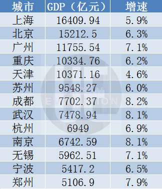 从增速看,相较于全国6.3%的平均线,中西部城市普遍增长更快,成都以8.2%的增速领跑。