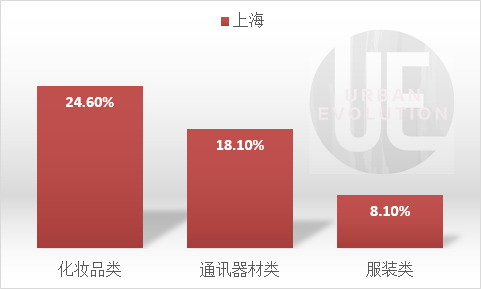 以上海为例,红色代表零售额主要增长点,化妆品类增长24.6%,通讯器材类增长18.1%,服装类增长8.1%。