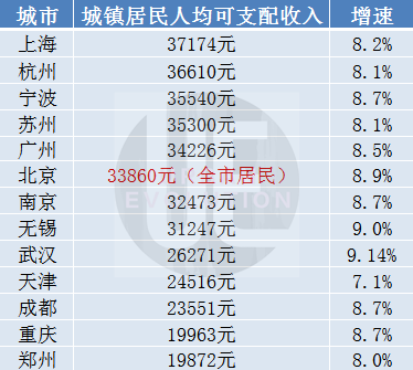 我们对比了一下,13座万亿城市中,上海、杭州、宁波、苏州、广州、北京(以全市居民计)、南京、无锡的城镇居民人均可支配收入超过3万元,其中,上海以3.7万元名列第一,武汉、天津、成都分别为2.6万元、2.4万元和2.3万元,重庆、郑州则还不到2万元。