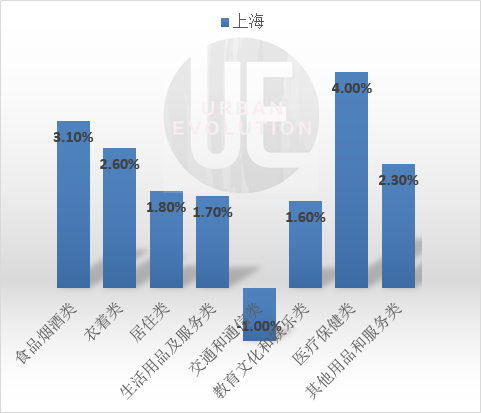 蓝色则代表居民消费价格,除交通和通讯类外,其他几个类别价格都有所上涨。