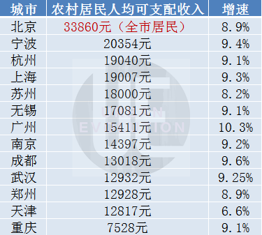 与此同时,随着下沉市场崛起,农村居民对消费的贡献越来越明显。从上半年数据来看,除天津外,其他城市农村居民人均可支配收入均取得高速增长,广州以10.3%的增速位列第一。同时,宁波表现抢眼,力压杭州、上海等城市,成为唯一一个超过2万元的城市。