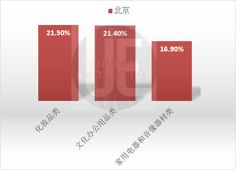 再看北京,限额以上批发和零售业企业实现的化妆品类、文化办公用品类、家用电器和音像器材类零售额分别增长21.5%、21.4%和16.9%。