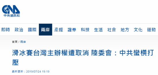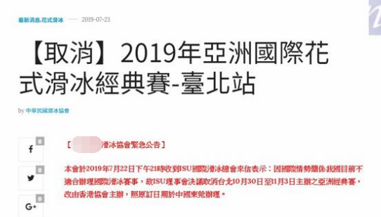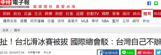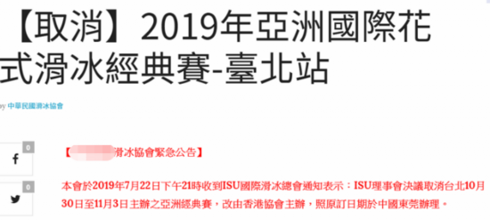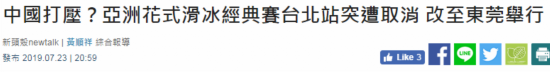 综合台湾“中时电子报”7月24日报道,此次比赛原定10月30日到11月3日在台北“小巨蛋”举办,但台滑冰协会22日晚间临时被通知赛事取消,于协会官网紧急公告,声称赛事因“国际情势”被改到大陆东莞市举办。