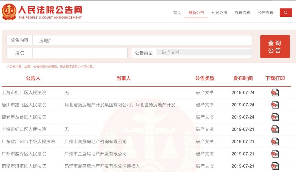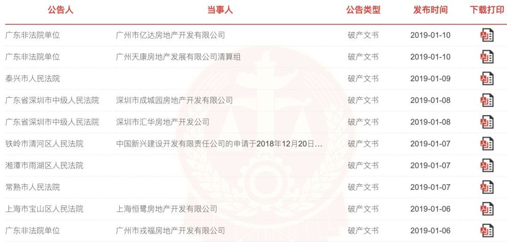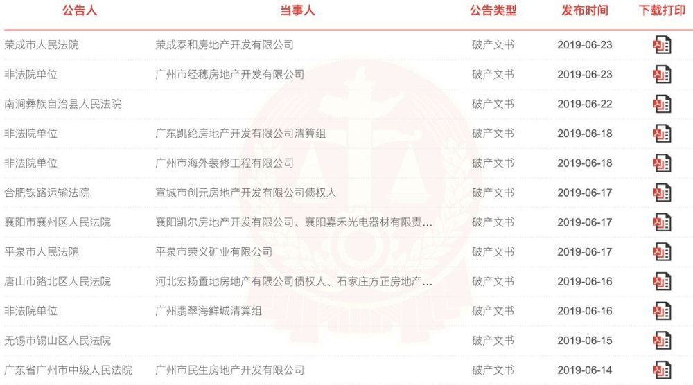 今年宣布破产的部分房企(图片来源:人民法院公告网)