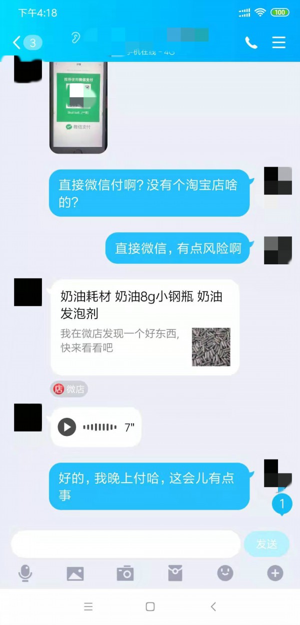 这名卖家随后在QQ上给记者发送了一个微店的链接,并要求记者在微店上下单。微店上显示的商品名称为:“奶油耗材,奶油8g小钢瓶,奶油发泡剂”。