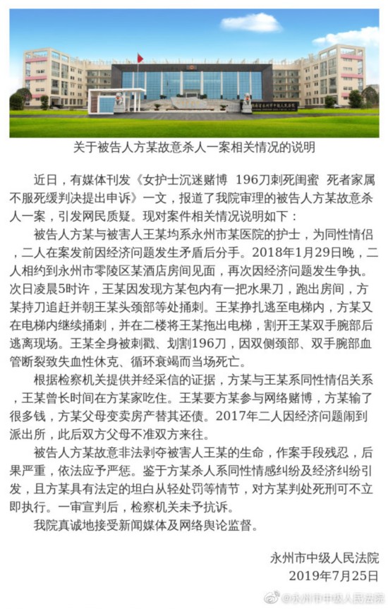 荔枝新闻讯 今日,永州市中级人民法院在其官微发布一则通报,就近日某媒体所刊发的《女护士沉迷赌博196刀刺死闺蜜 死者家属不服死缓刑判决提出申诉》一事所引发的网民质疑做出了相关情况说明。通报全文如下: