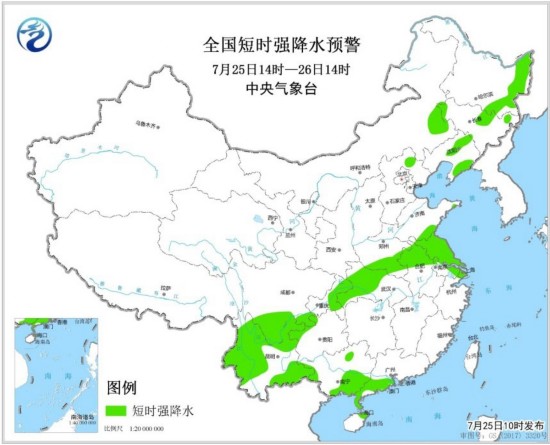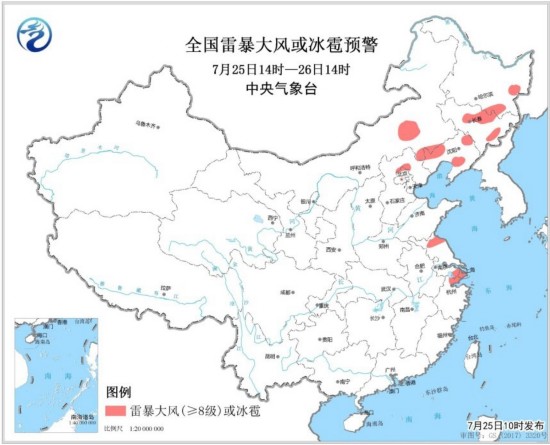 预计7月25日14时至26日14时,内蒙古东部、黑龙江东部和南部、吉林北部和东部、辽宁西部和中南部、河北东北部、北京北部、江苏北部和东南部、浙江北部等地的部分地区将有8-10级雷暴大风或冰雹天气;此外,内蒙古东部、黑龙江东部、吉林北部、辽宁中东部、河北东北部、山东南部、河南南部、安徽中北部、江苏、湖北中西部、重庆中东部、四川南部、贵州西北部、云南西部和南部、广西南部、广东西南部、海南北部等地的部分地区将有短时强降水,小时雨量20-50毫米,局地可达60毫米以上。