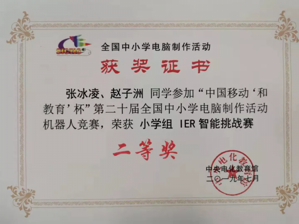 2019年7月17日-21日,第二十届全国中小学电脑制作活动夏令营在潍坊科技学院举行。泗阳县众兴小学机器人社团的小队员张冰凌和赵子洲在第二十届全国中小学电脑制作活动机器人竞赛中,荣获小学组IER智能挑战赛二等奖。