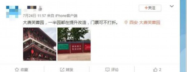 在该园区的公共服务信息平台里,公告图显示近二分之一的主环路标注为围挡区域。西安大唐芙蓉园景区售票负责人告诉记者,6月份园区内进行维护工程后,公司每日都在通过微博、微信和分布在园区内外的公示牌发布了提醒信息,告知游客院内维护情况,“有的游客可能逛园心急,没注意没看到公告”。