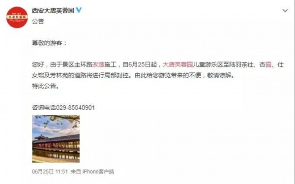 微博网友@sxf680 图收到崔先生的投诉后,记者在大唐芙蓉园公众服务信息平台查询到,园区已发公告:近期将对景区杏园、仕女馆及芳林苑沿途主干道路,以及胡店、紫云楼区域进行局部封控,游客在观光时需按现场引导标识游览。