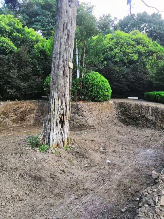 古树生长需要适宜的温湿度,需要在基坑底部树干两米内平铺松柏树皮碎块,其余部分满植矮麦冬,这一措施可以自然调节土壤温湿度。