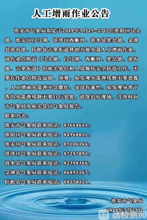 今天(7月25日),淮安市气象局对外发布《人工增雨作业公告》。公告称:将于25日—27日,在当地多个区县择机开展火箭人工增雨作业。