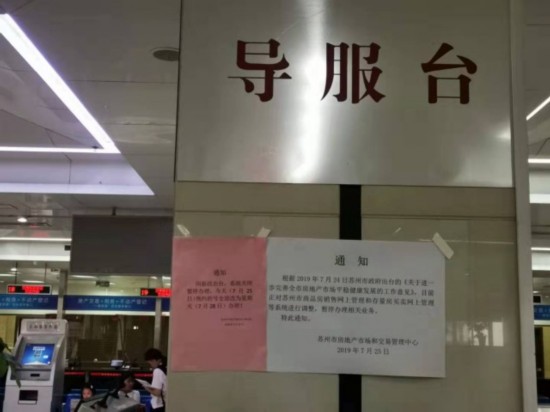 昨天是新政实行第一天,上午九点左右,看苏州记者来到苏州市房地产市场和交易管理中心,却发现交易大厅已暂停办理业务,门口贴着一则通知:“目前正对苏州市商品房销售网上管理和存量房买卖网上管理等系统进行调整,暂停办理相关业务。”