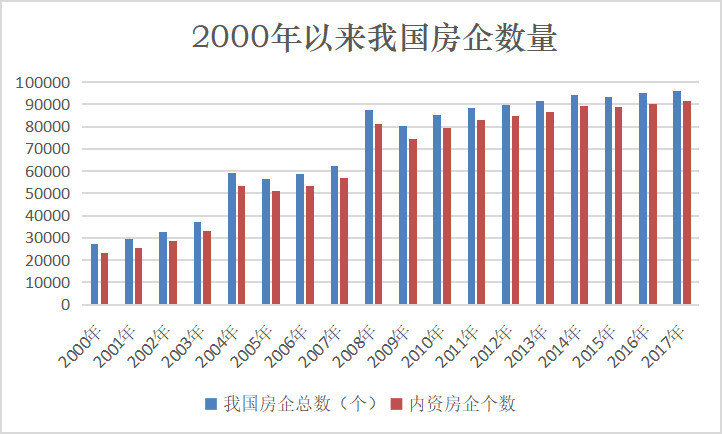 1998年房改之后,我国房企房地产迎来高速发展,房企数量不断增长,根据国家统计局的数据,1998年我国房企24378个,2017年增长到了95897个。