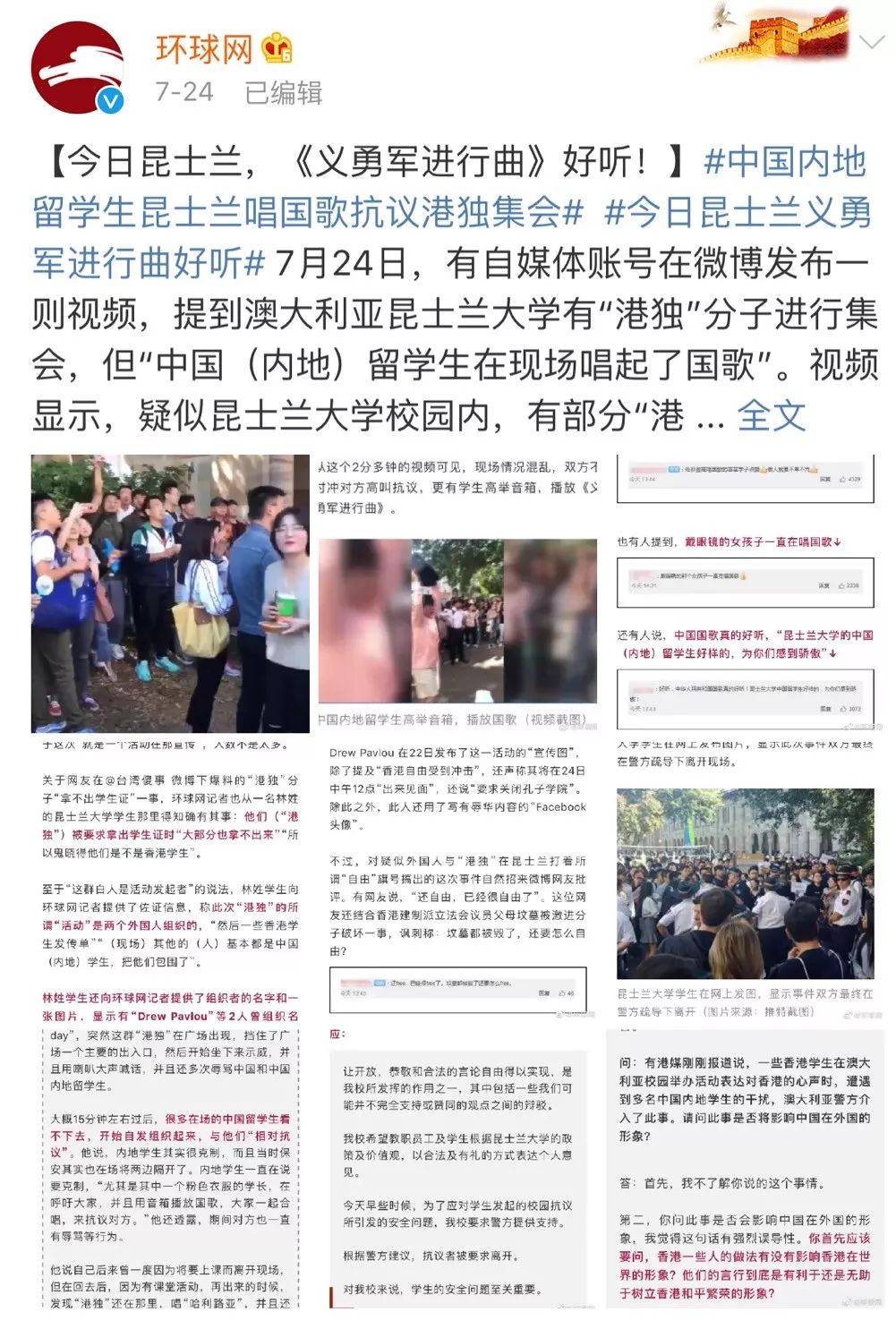 近日,在澳大利亚昆士兰大学开学当天,中国留学生自发集结,以高唱国歌的形式,向反华闹事者做出反击。7月25日,我驻澳布里斯班总领馆发声……