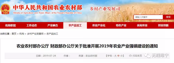 2018年,农业农村部、财政部启动实施农业产业强镇示范建设,支持发展壮大优势产业,培育乡村产业新业态新模式,推进农村产业融合、产城融合、城乡融合。建设一批产业兴旺、经济繁荣、绿色美丽、宜业宜居的农业产业强镇。