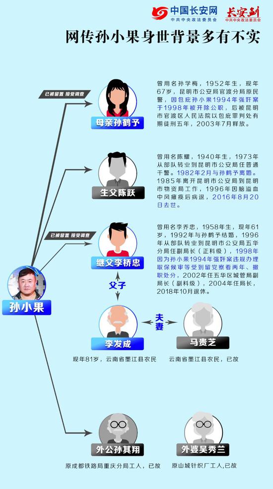 孙小果继父李桥忠,曾用名李乔忠,1958年生,现年61岁,1992年与孙鹤予结婚,1996年从部队转业到昆明市公安局五华分局任副局长(正科级),1998年因为孙小果1994年强奸案违规办理取保候审等受到留党察看两年、撤职处分,2002年任五华区城管局副局长(副科级),2004年任局长,2018年10月退休。