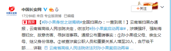 云南省高级人民法院再审决定书显示,1998年,昆明市中级人民法院对孙小果以强奸、强制侮辱妇女、故意伤害、寻衅滋事罪判处死刑;1999年,云南省高级人民法院二审改判其死刑,缓期二年执行;2007年,云南省高级人民法院再审改判孙小果有期徒刑二十年。