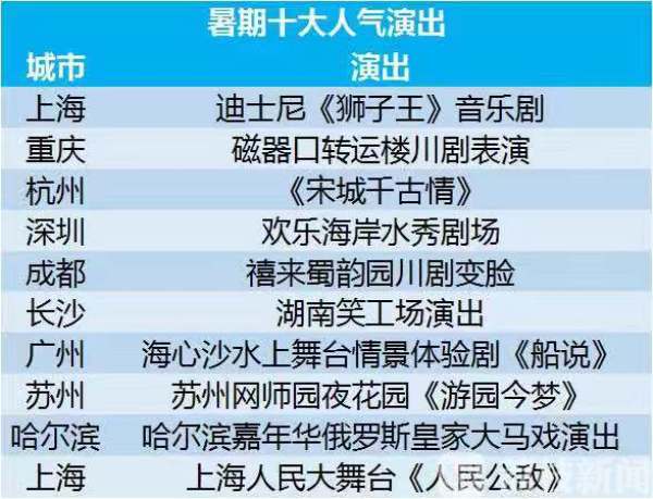 剧场、演出、秀,也是夜游最具特色的体验之一。根据预订数据,暑期十大夜游演出活动有:迪士尼《狮子王》音乐剧、磁器口转运楼川剧表演、《宋城千古情》、欢乐海岸水秀剧场、禧来蜀韵园川剧变脸、湖南笑工场演出、海心沙水上舞台情景体验剧《船说》、苏州网师园夜花园《游园今梦》、哈尔滨嘉年华俄罗斯皇家大马戏演出和上海人民大舞台《人民公敌》。