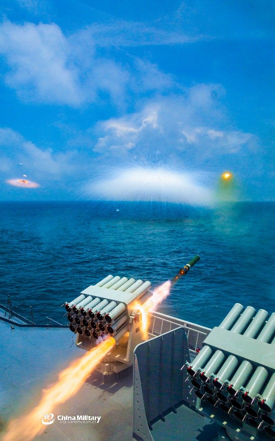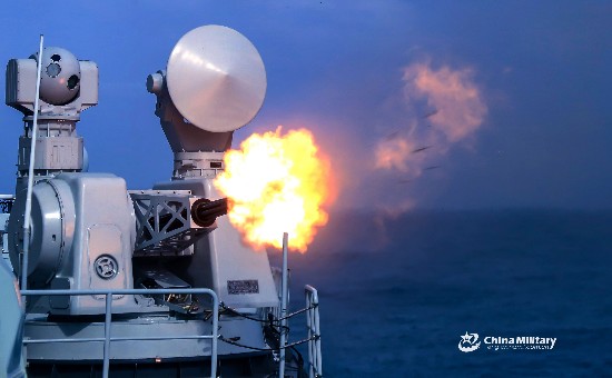 近日,中国人民解放军南方战区司令部下属海军的驱逐舰舰队,在南海海域进行海上火力演习。图为“武汉”号(舷号169)导弹驱逐舰的H/PJ-12型7管30毫米舰炮开火。