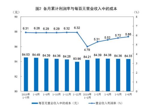 1-6月份,规模以上工业企业每百元营业收入中的成本为84.33元,同比增加0.22元;每百元营业收入中的费用为8.66元,同比增加0.21元。