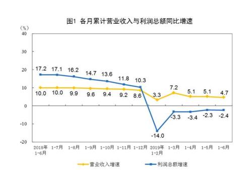 6月份,规模以上工业企业实现利润总额6019.2亿元,同比下降3.1%,5月份为同比增长1.1%。
