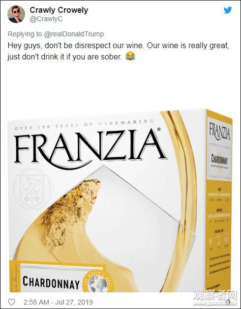据“政客”新闻网(Politico)消息,26日发完推特后,特朗普在椭圆形办公室被问及这个问题,滴酒不沾的他表示:“我一直更喜欢美国葡萄酒,而不是法国葡萄酒。即使我不喝酒,我只是喜欢它们的样子。”